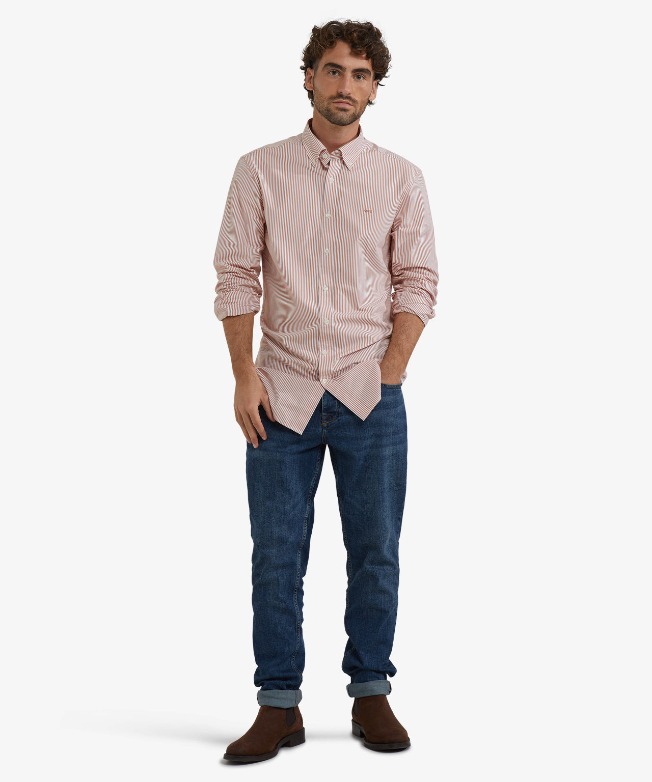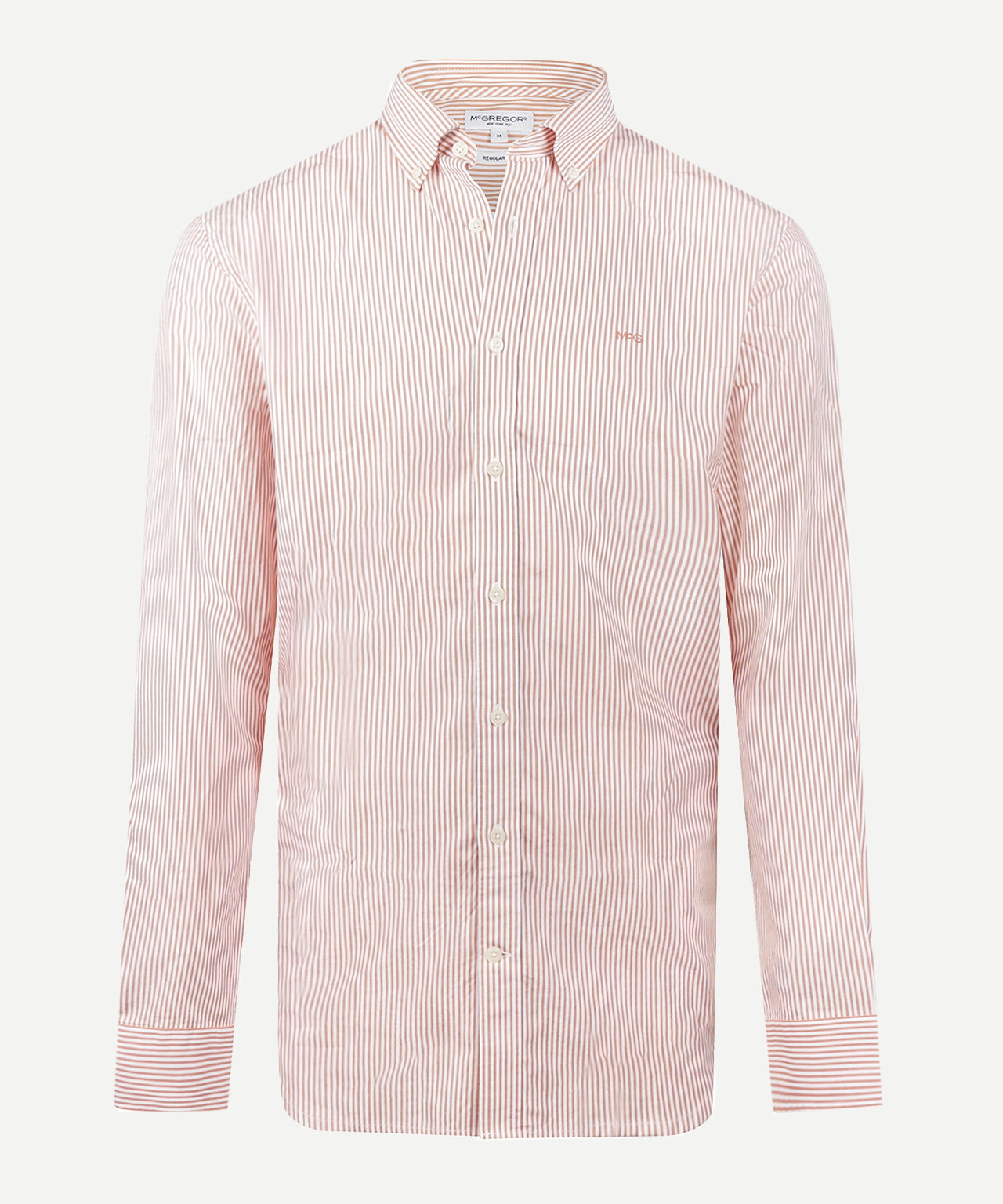 Crafted from 100% premium cotton, this shirt has a regular fit for comfortable everyday wear. It features long sleeves, a button-down collar, and a subtle McGregor logo on the chest. The poplin weave is fine and dense, giving it a smooth feel with a subtle sheen, while the peached finish provides a soft, comfortable touch. The subtle stripe pattern gives the shirt a timeless and versatile look.