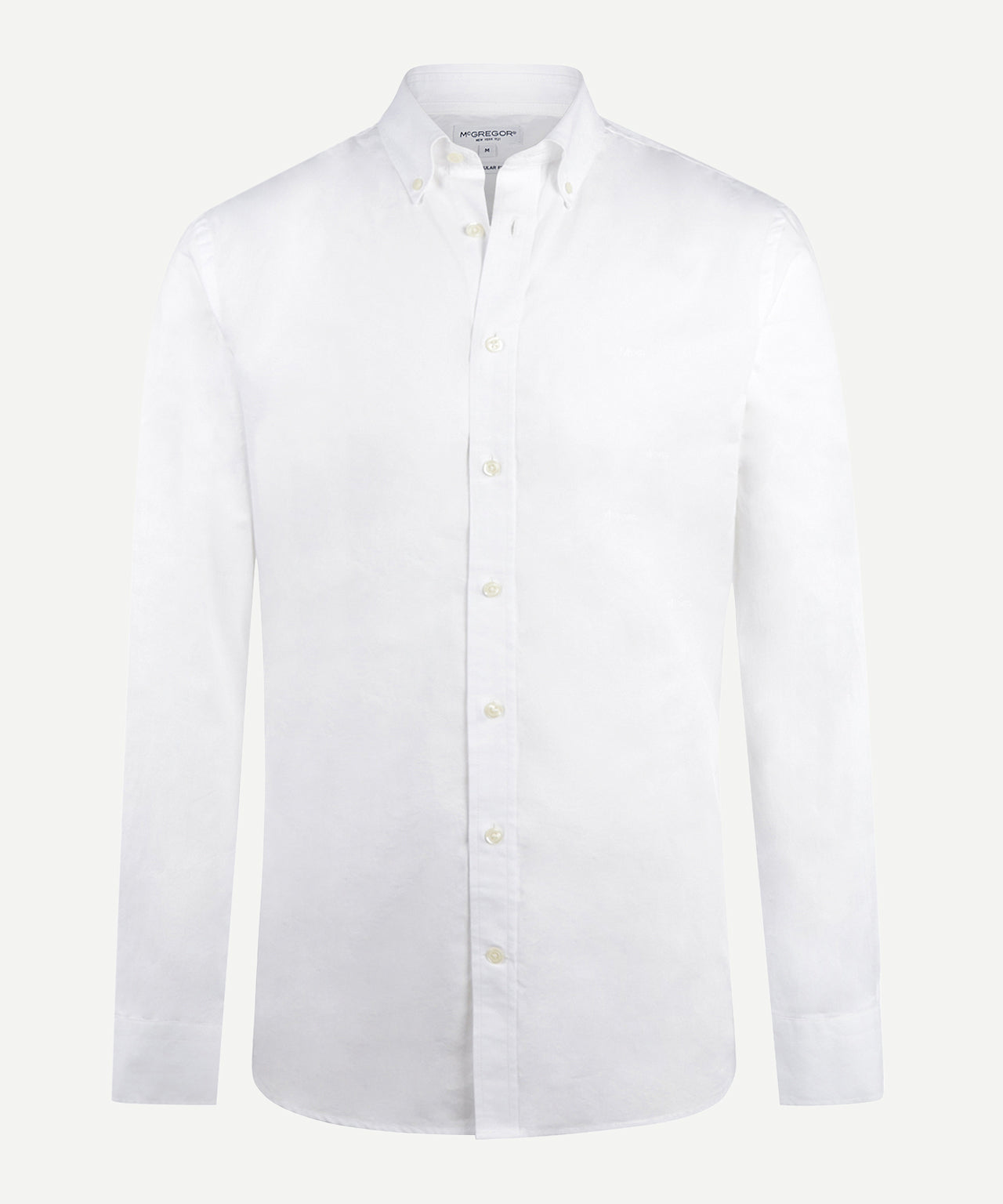 This shirt is made of 100% premium cotton and has a regular fit for comfortable everyday wear. It features long sleeves, a button-down collar, and a subtle McGregor logo on the chest. The poplin weave is fine and dense, giving it a soft, slightly sheen.