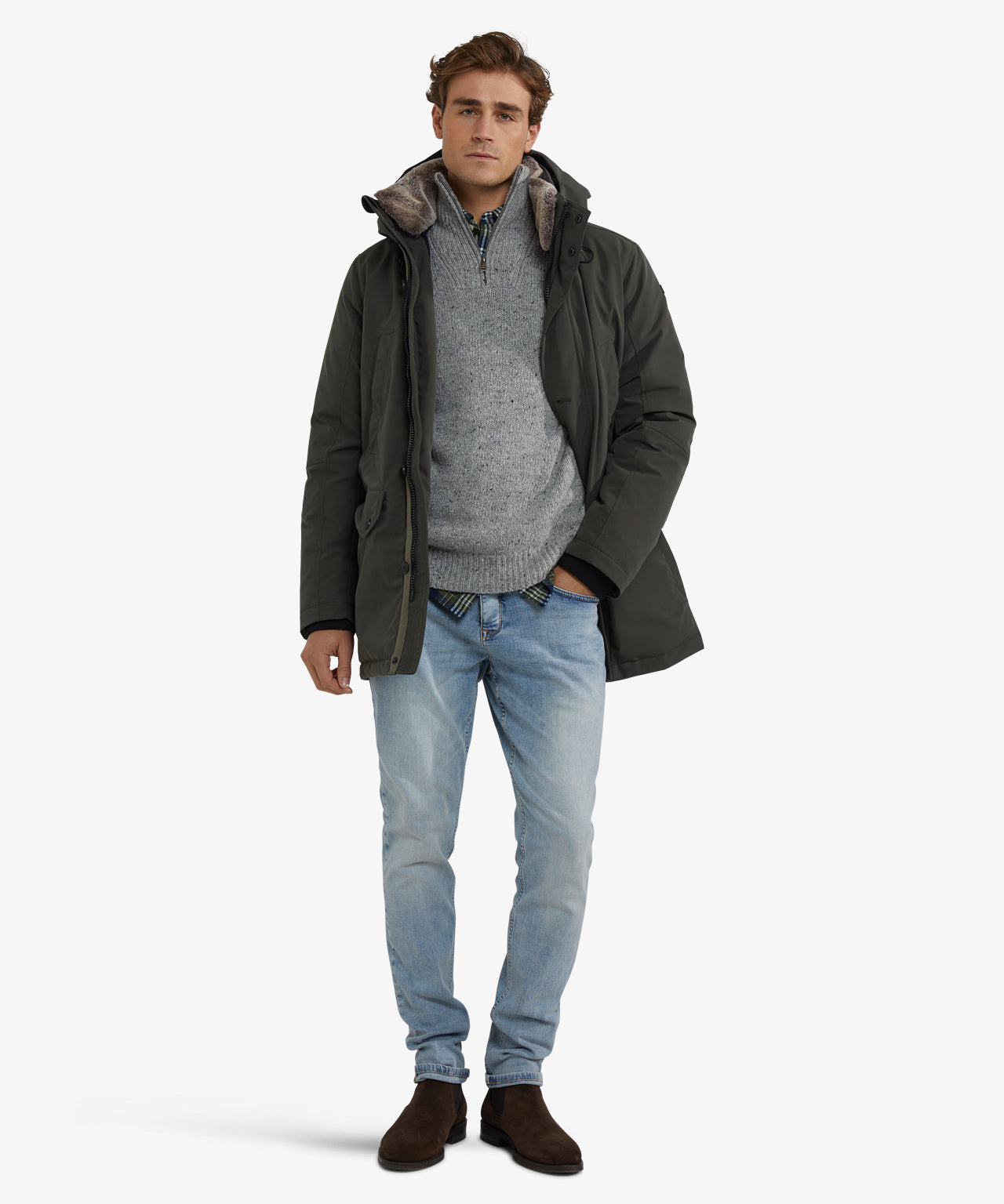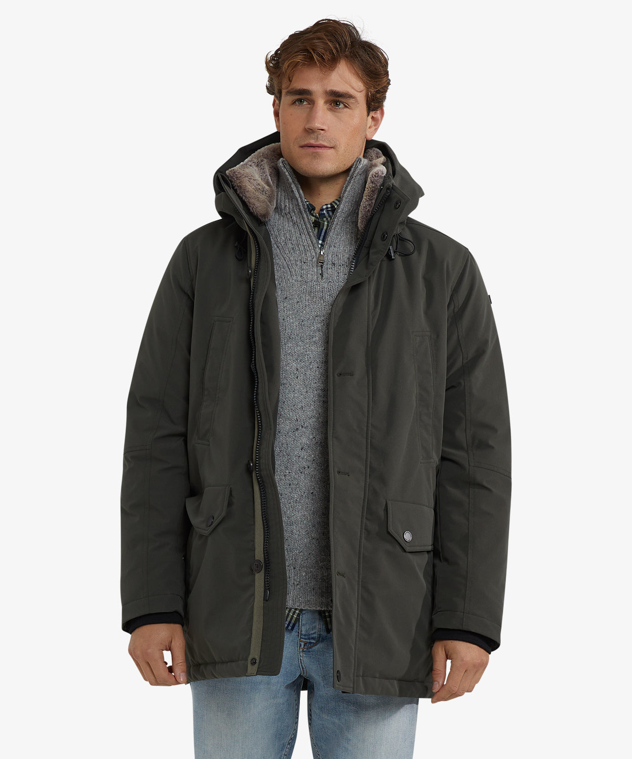 This parka features a zip and button closure, a hood, handwarmer pockets, regular side pockets with buttons, and a practical hanger loop. Made of 90% polyester and 10% nylon in a regular fit, it ensures durability and freedom of movement. The jacket is finished with a detachable faux fur collar, wonderfully soft, but obviously not real fur. If you prefer to wear it without the collar, it can easily be detached. The parka coat combines practical details with a timeless look, ideal for everyday wear in changeable weather.