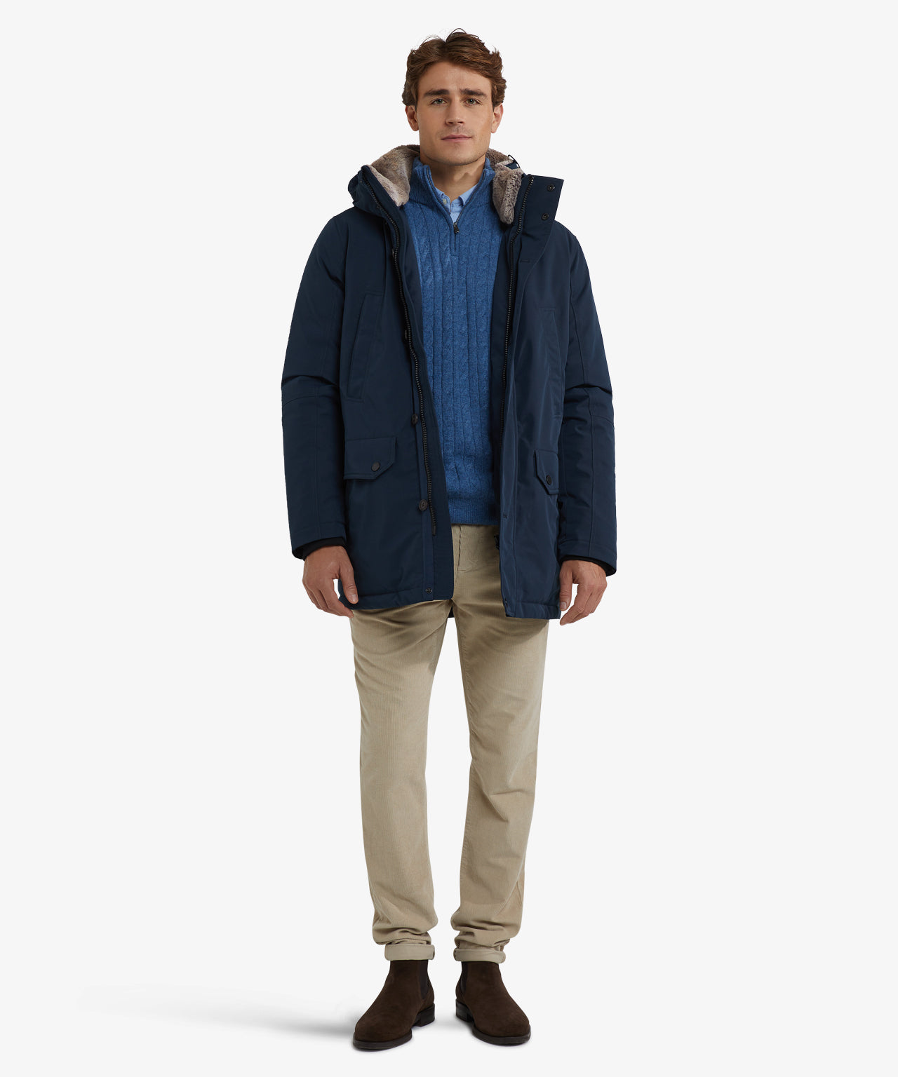 This parka features a zip and button closure, a hood, handwarmer pockets, regular side pockets with buttons, and a practical hanger loop. Made of 90% polyester and 10% nylon in a regular fit, it ensures durability and freedom of movement. The jacket is finished with a detachable faux fur collar, wonderfully soft, but obviously not real fur. If you prefer to wear it without the collar, it can easily be detached. The parka coat combines practical details with a timeless look, ideal for everyday wear in changeable weather.