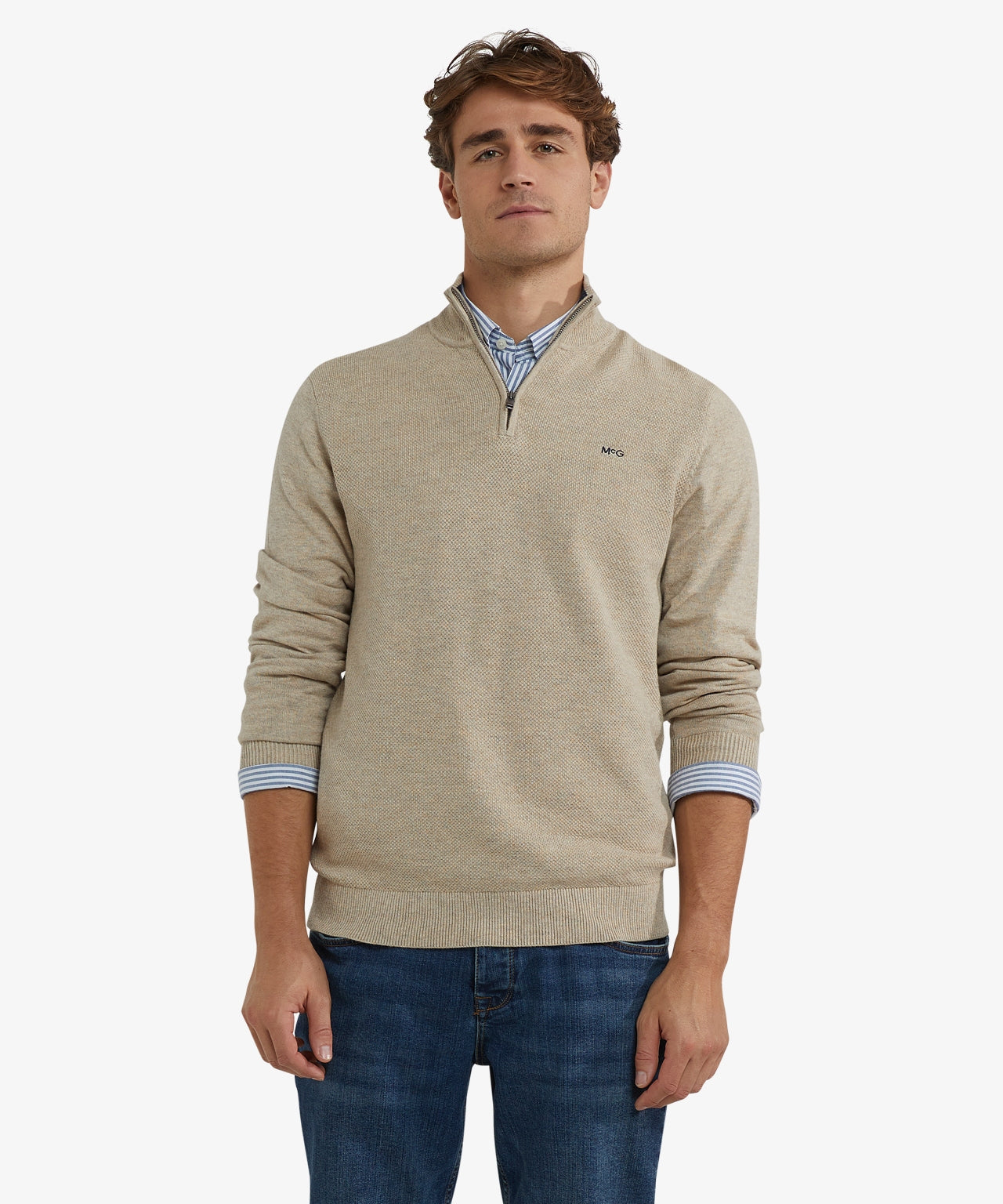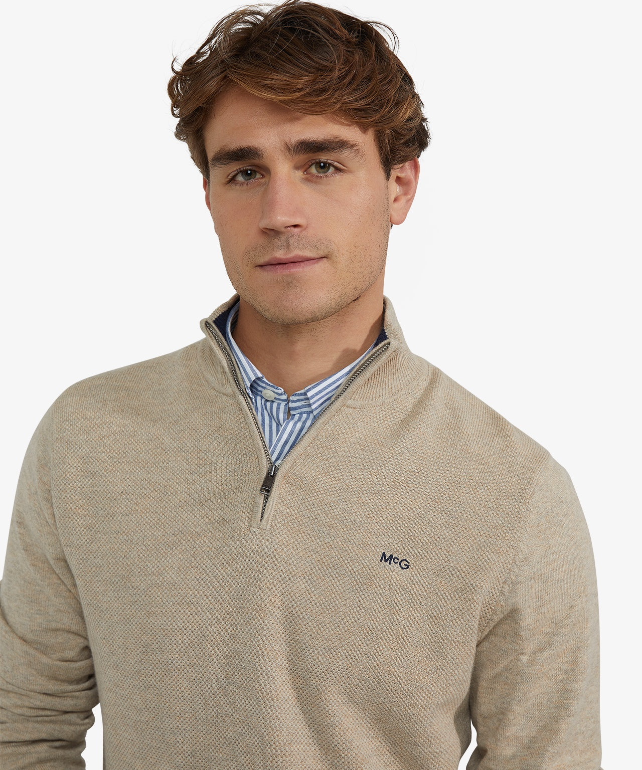This half-zip sweater is crafted from a premium blend of 70% cotton and 30% merino wool, creating a soft, comfortable, and luxurious feel. It has a regular fit, long sleeves, a ribbed turtleneck, and ribbed cuffs. A subtle McGregor logo is featured on the chest. A versatile and stylish piece that can be dressed up or down.