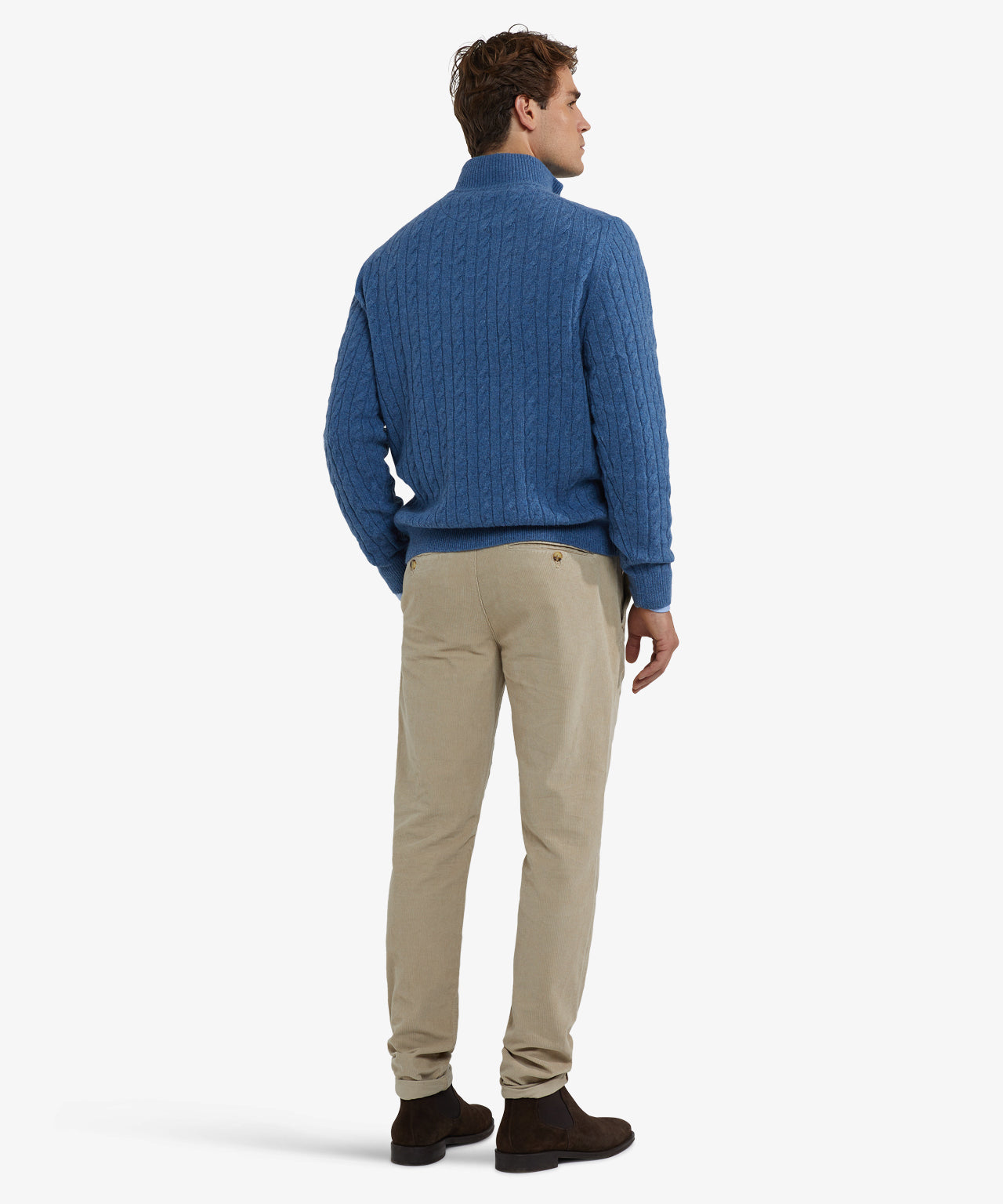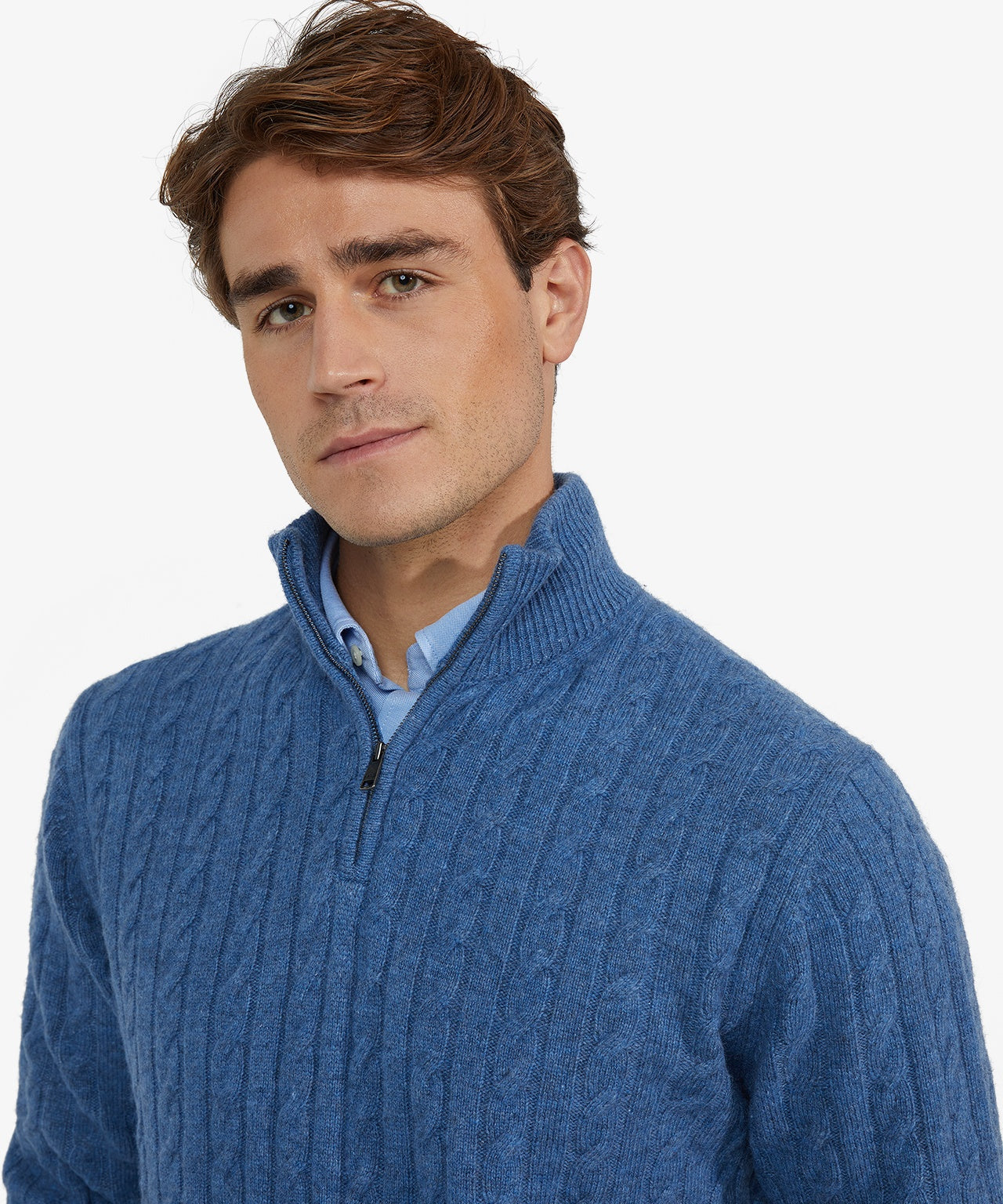 This half-zip sweater is crafted from a premium blend of 70% cotton and 30% merino wool, creating a soft, comfortable, and luxurious look. It has a regular fit, long sleeves, a ribbed turtleneck, and ribbed cuffs. A subtle McGregor logo is featured on the chest. A versatile sweater that can be worn stylishly, whether casual or formal.