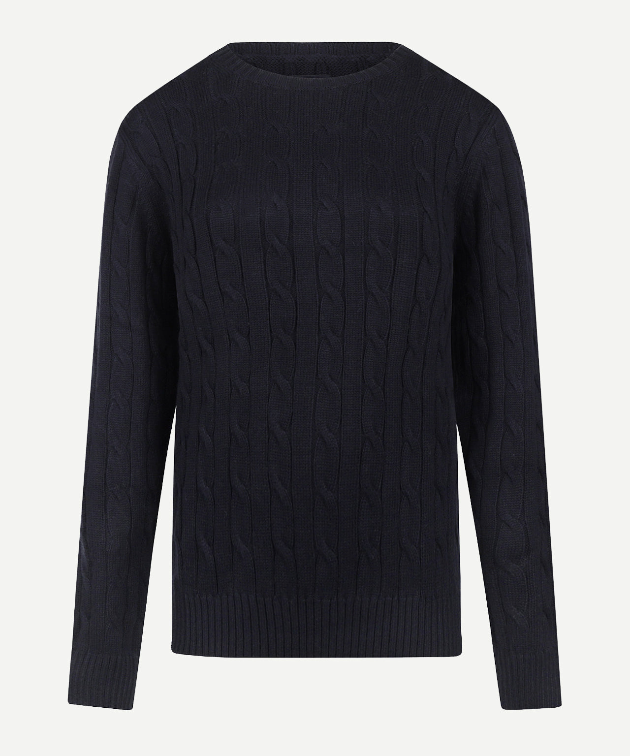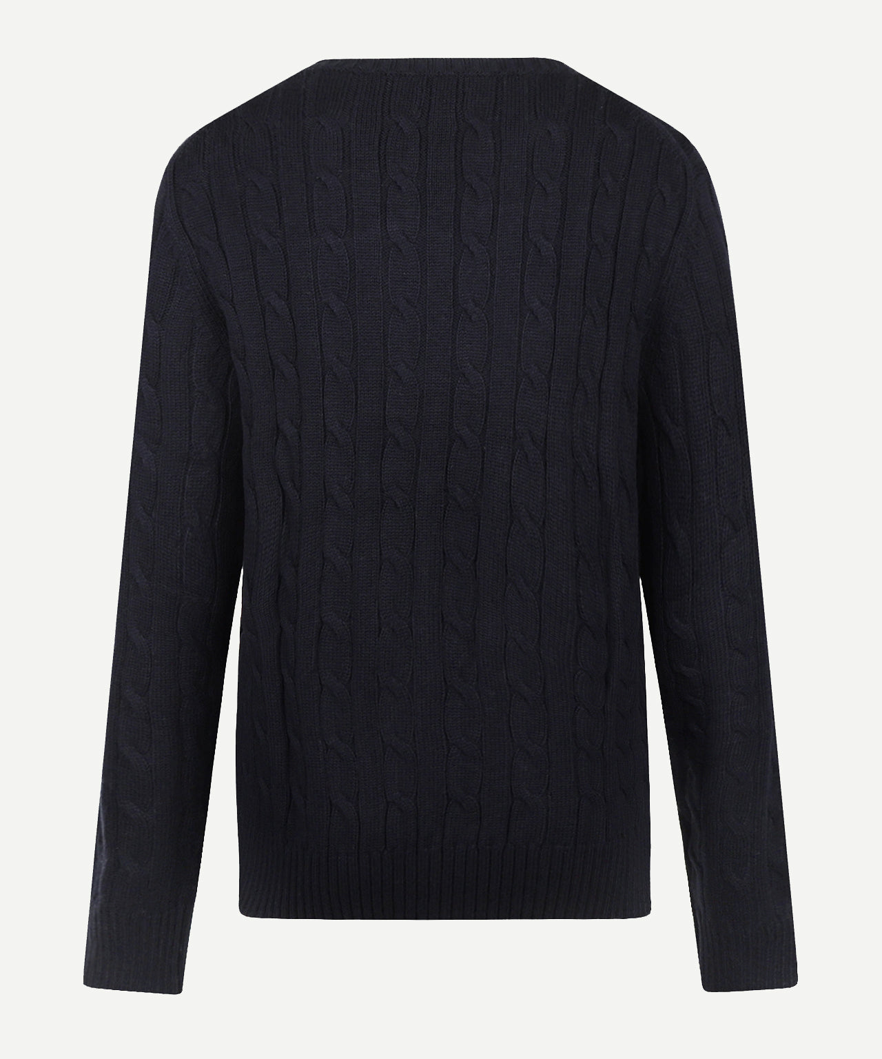 Crafted from a premium blend of 95% cotton and 5% cashmere, this crew neck sweater offers a soft and comfortable feel. The combination of materials creates a lightweight and luxurious feel, ideal for everyday wear. The classic cable knit pattern gives this sweater a timeless and stylish look. The ribbed cuffs and crew neck create a neat finish and a beautiful fit. A versatile and refined piece that can be worn stylishly season after season.